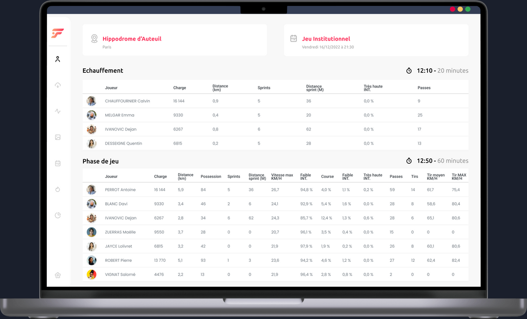 Suivez avec précision les statistiques physiques et techniques. Distance parcourue, sprints, intensités, charge externe, passes, tirs et puissance de frappe : Footbar Team capture chaque détail pour vous offrir une vision complète de la performance de vos joueurs sur le terrain.